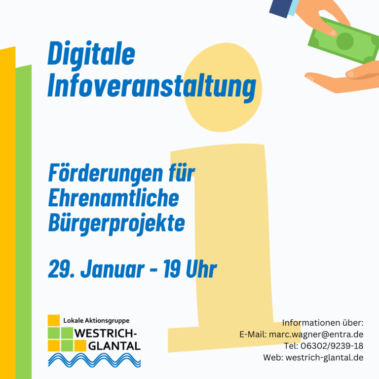 Das Regionalmanagement der LEADER-Region Westrich-Glantal lädt herzlich zu einer digitalen Informationsveranstaltung zu den Ehrenamtlichen Bürgerprojekten ein!