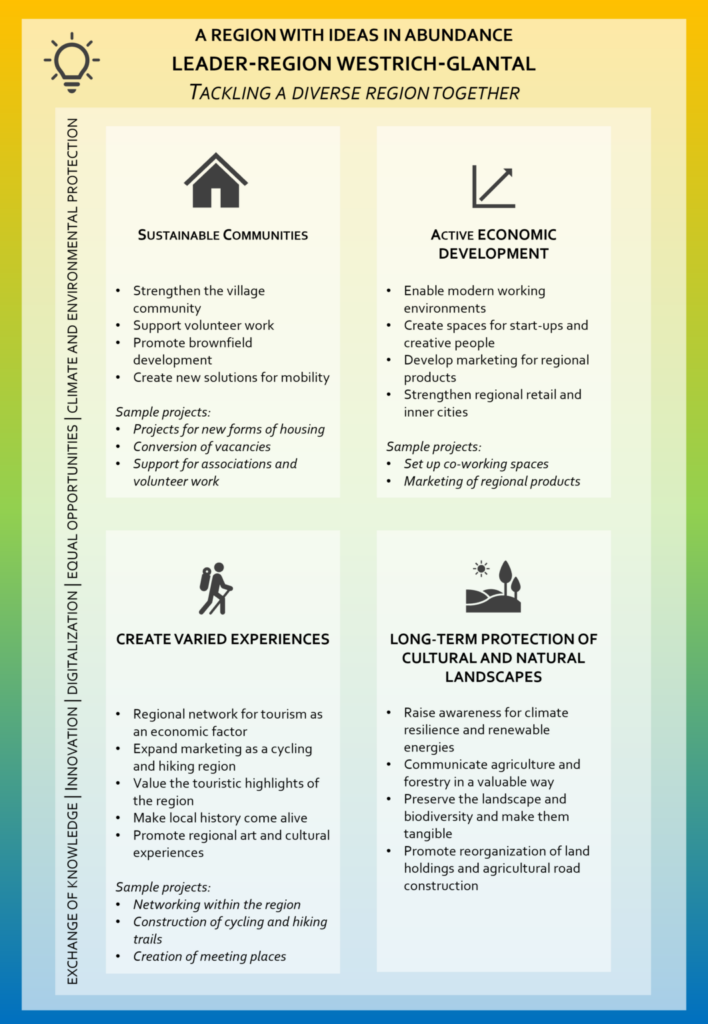 Central principles of the LEADER approach are projects that benefit the development of rural areas and the participation of all residents of the region. The spectrum of funded projects ranges from economic, social, and cultural to historical projects. A wide variety of interest groups are represented in our diverse LAG board of directors. In addition, the three fields of action of the past funding period were expanded to include a further field to be able to address a broader range of topics. The LAG repeatedly offers information evenings or working groups to give all citizens of the region the opportunity to help shape the work of the LAG.